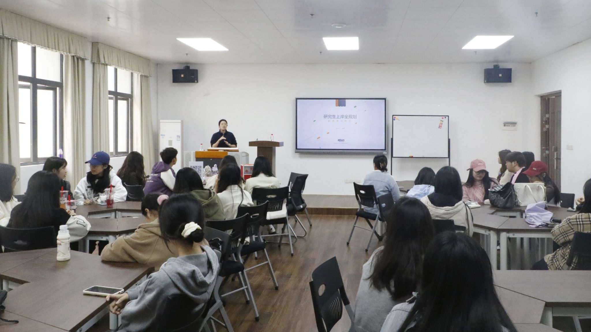 会上,孙珊娜老师首先为同学们分析了国内考研的情况,以及当前对海外留学生的鼓励政策等,还重点就日本和韩国两国大学学费、奖学金制度、对语言的要求、对留学生的政策、饮食习惯和生活环境等方面进行讲解;根据学生提问要求,孙珊娜老师对到新加坡、马来西亚等地学习深造的有关要求进行了讲解。孙珊娜老师还对报考特征、报考流程、留学优势、就业前景、相关安全常识等进行了介绍,在互动环节中大家纷纷咨询有关出国深造和就业相关事宜,现场气氛活跃。