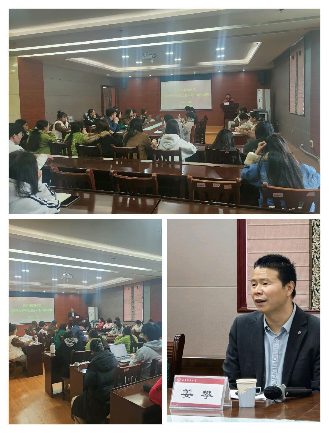 活动邀请广西建设职业技术学院的副教授、广西佳欣人力资源有限公司董事长姜攀作为主讲老师。作为国家二级创业咨询师、国家高级职业指导师及生涯规划师,“全国优秀创新创业导师”称号获得者,姜老师分享了个人实战经验和指导成果,并就如何做好选题、团队组建、项目策划等进行辅导,还对各团队的项目做了一对一指导。姜老师丰富的经验、专业的知识、独特的见解和悉心的指导,给各团队留下了深刻印象,大家纷纷表示这次辅导干货多、收获大,对进一步激发团队的创新思维、提升大家创新实践能力有十分积极的作用。