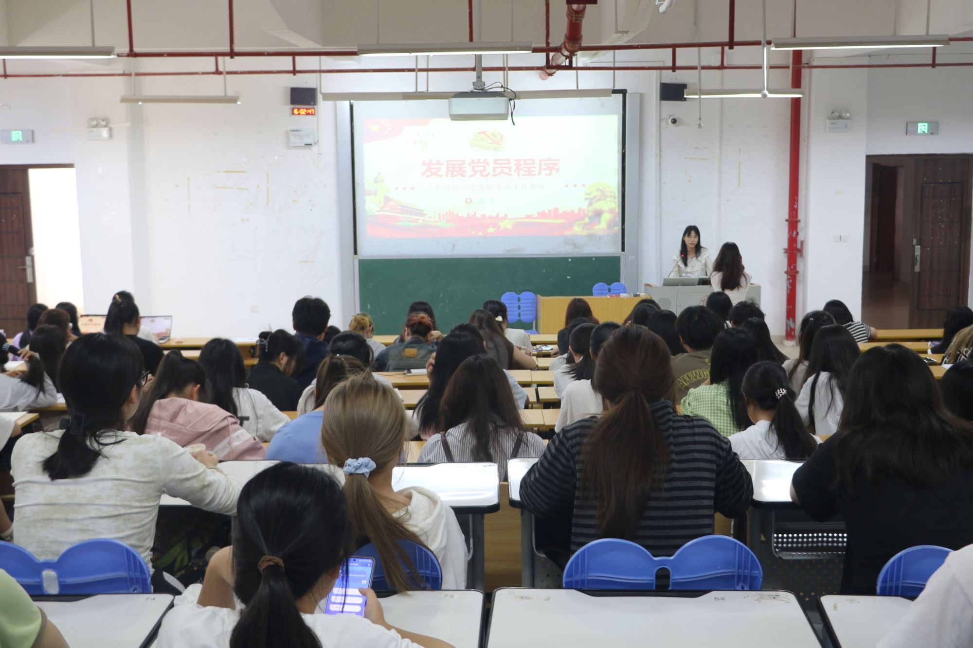 郭芯老师围绕发展党员工作程序展开叙述。她首先明确了发展党员工作的总要求是以控制总量为重点,以优化结构为关键,以提高质量为核心,以发挥作用为目的。她强调发展党员工作需严格按照有关程序进行,分别从申请入党、入党积极分子的确定和培养教育、发展对象的确定和考察、预备党员的接收、预备党员的教育考察和转正五个阶段进行详细讲解。她为同学们指明了入党的前进方向,鼓励学生积极向党组织靠拢,追求卓越,实现个人成长。