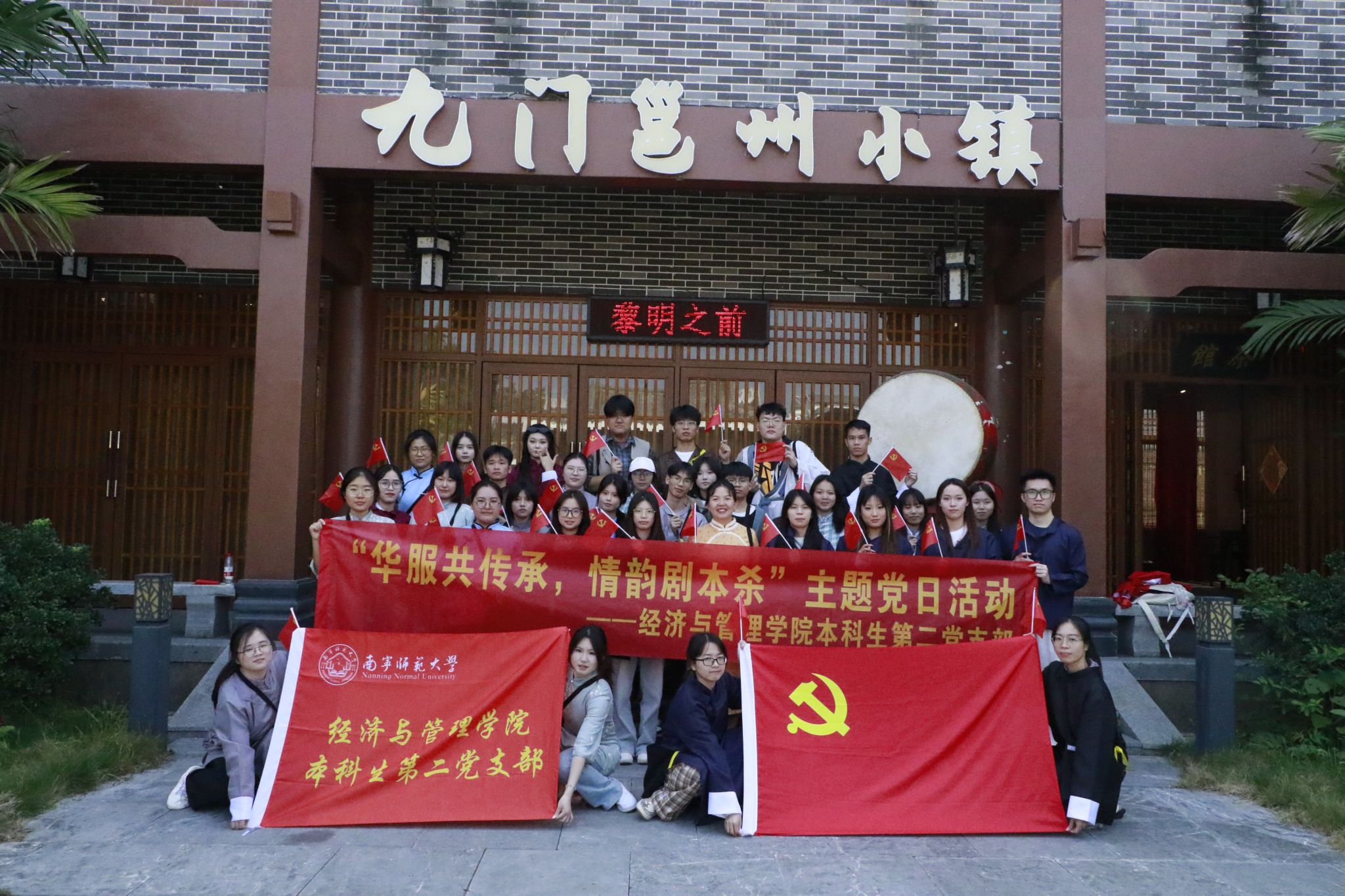 为激发同学们爱国热情,加深对历史事件的理解与感受。11月23 日,BWIN必赢在南宁市西乡塘区九门邕州小镇参与民国谍战实景沉浸式红色剧本游《黎明之前》,此次剧本游主要演绎了1942 年国民党中统局特务制造震惊广西的桂林“七九”事件,破坏中共广西省工委,大肆逮捕和杀害共产党员和革命群众的故事。本科生第二党支部全体党员、部分入党积极分子共计38人参加。