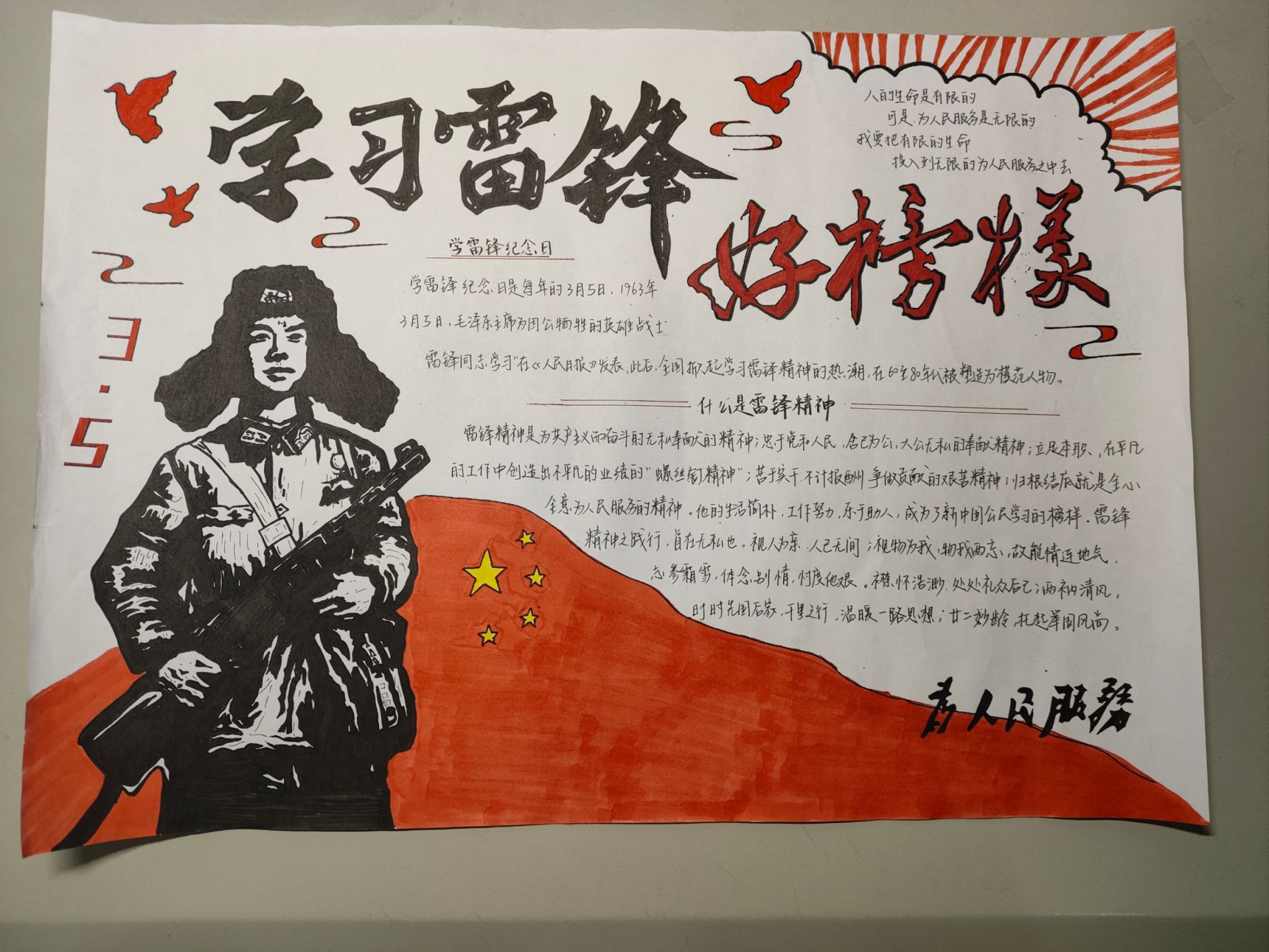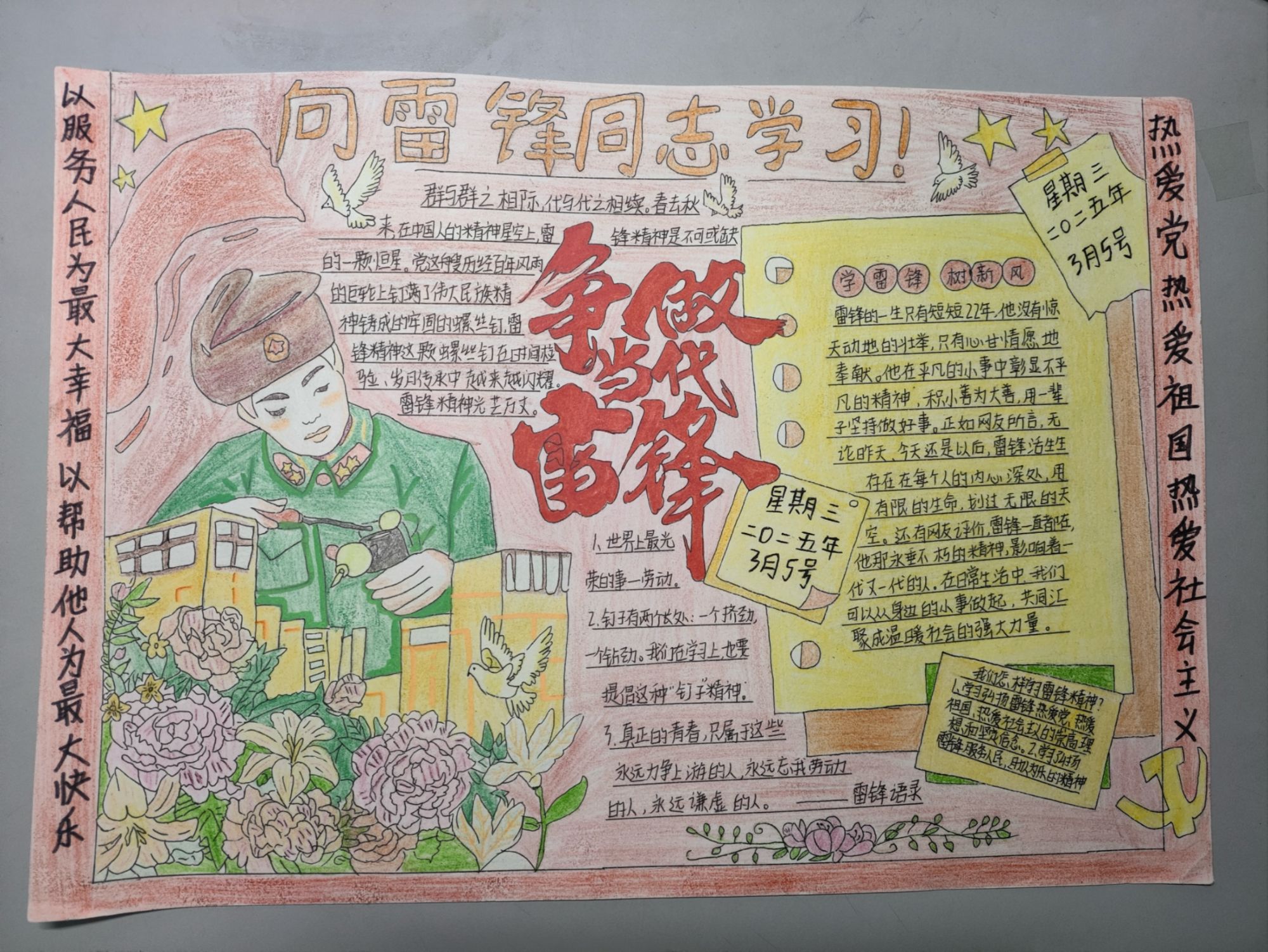 活动期间,同学们以手抄报为载体,通过绘画、书法的表现形式,生动展现了雷锋同志的光辉事迹、经典语录以及新时代青年对雷锋精神的理解。手抄报内容涵盖“助人为乐”“爱岗敬业”“艰苦奋斗”等主题,既有对雷锋故事的深情回顾,也有对雷锋精神的深刻诠释与时代传承。活动结束后,青年志愿者协会共收到37份作品,不少作品以创意排版、工整字迹和深刻内容脱颖而出,展现了同学们对雷锋精神的独特诠释。此次活动不仅为同学们提供了展现艺术才华的平台,更通过实践深化了青年一代对雷锋精神的理解。参与者在创作中感悟到“钉子精神”的坚持与奉献价值,进一步增强了社会责任感和集体凝聚力。