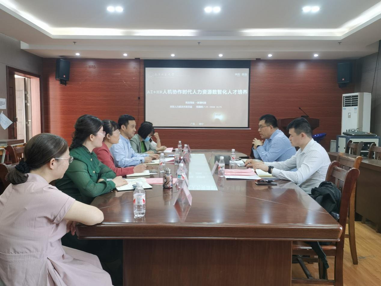 用友集团&新道科技股份公司专注新工科、新商科、社培认证三大领域,为高等教育和职业教育提供数字人力、数字营销、区块链与金融科技等,以及构建校企合作、产教融合新范式。陈国峰总监详细介绍了公司在数字化人力资源管理领域的前沿技术、行业趋势及校企合作案例。他表示,AI+HR人机协作可以更好地培养出人力资源数智化人才,同时可以为高校提供课程共建、实训平台、师资培训等支持,助力人力资源管理专业升级。在交流环节,人力资源管理系主任黄世政教授及与会教师就专业课程设置、实践教学痛点、学生就业能力培养等问题与企业代表展开热烈讨论。