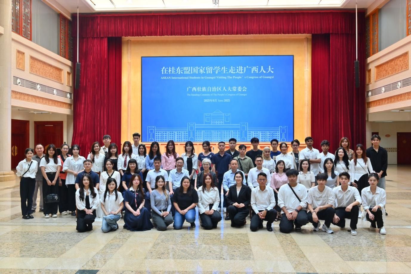 在讲解人员的带领下,留学生代表参观了广西人民大会堂,了解了大会堂的历史背景和主要功能。通过讲解和现场参观,学生们对中国人大制度和政治活动有了更直观地了解。在参观过程中,留学生代表们认真听讲,并与来自不同国家的同学们相互交流。他们表示,这次参观让他们对中国政治架构有了深刻认知,加深了其对中国文化的理解,同时也增进了彼此之间的友谊。