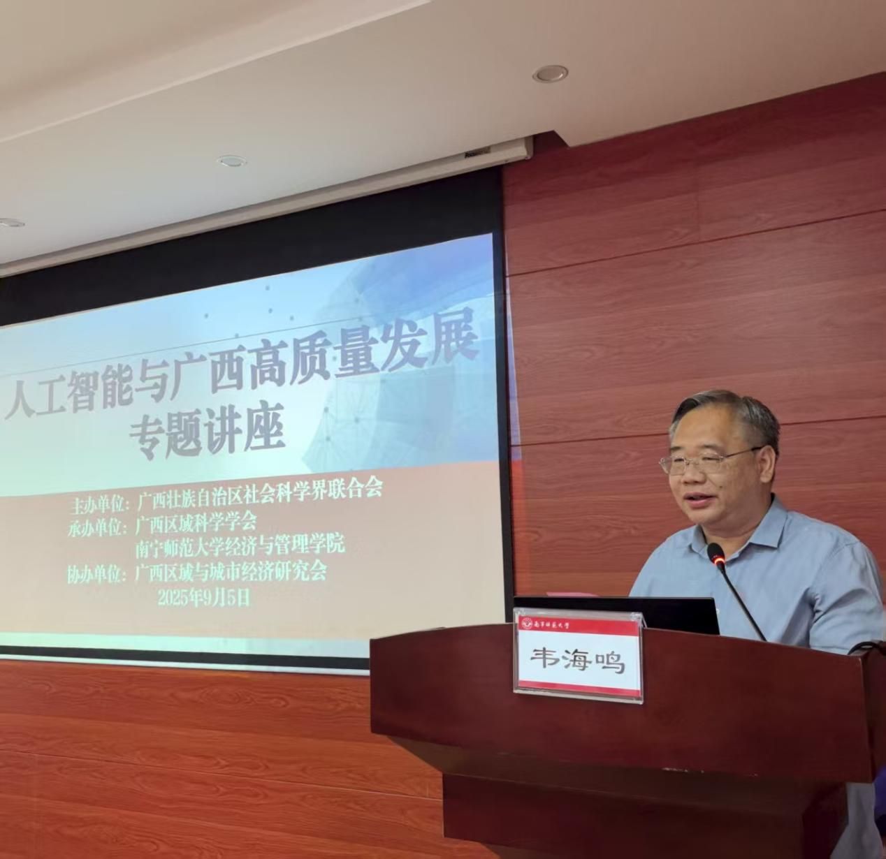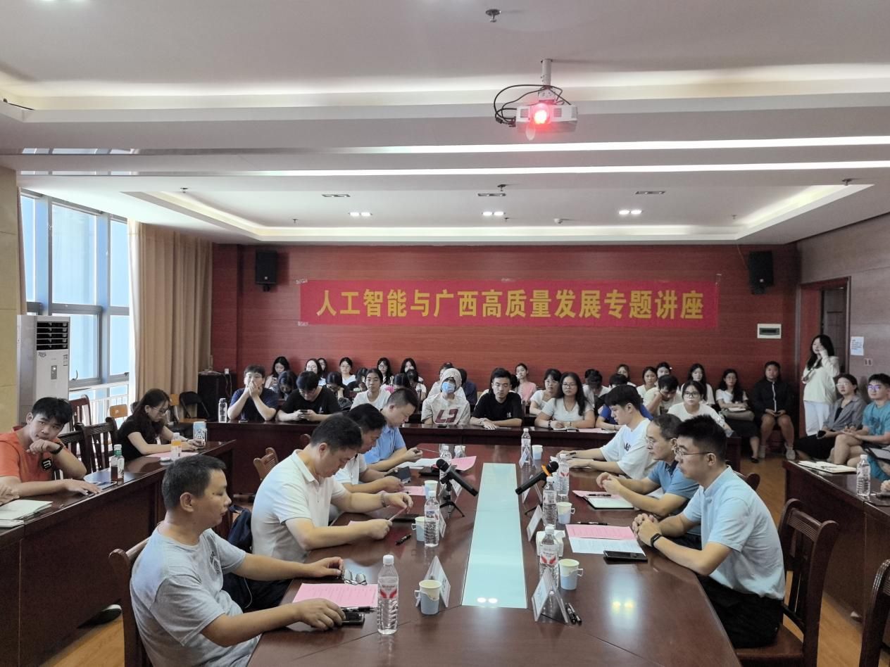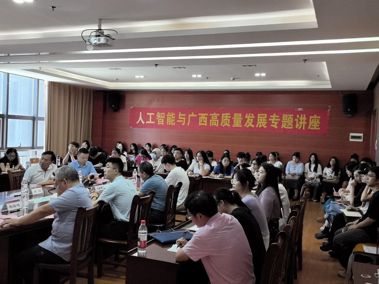为深入学习贯彻习近平总书记关于人工智能的重要论述,贯彻落实自治区党委关于发展人工智能赋能千行百业的决策部署,聚焦人工智能与广西经济社会各领域融合发展的关键问题,探索高质量发展新路径、新动能。9月5日,由广西壮族自治区社会科学界联合会主办,广西区域科学学会与BWIN必赢,BWIN必赢承办,广西区域与城市经济研究会协办的“人工智能与广西高质量发展”专题讲座在学校五合校区顺利举行。本次讲座由BWIN必赢党委书记韦海鸣教授主持,来自校内外专家、学者约60人参会。