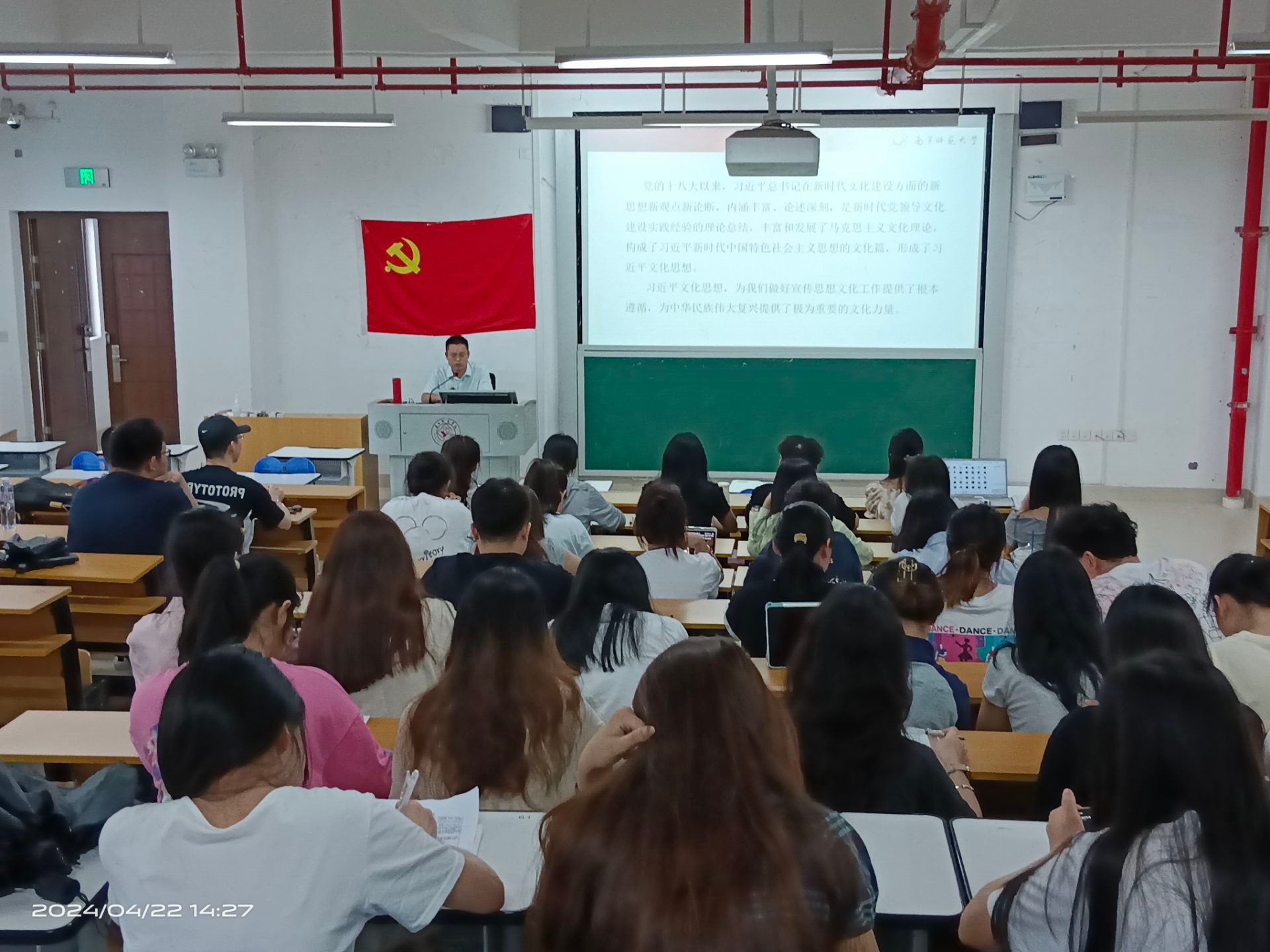 课上,第一讲由纪明书记紧密围绕学习贯彻习近平文化思想全面推进强国建设、民族复兴伟业主题,重点从深刻领悟习近平文化思想的重大意义、主要内容、深入贯彻落实习近平文化思想三个方面进行深入系统解读,引导在座的预备党员准确把握党的十八大以来习近平文化思想核心,宣传习近平文化思想,深刻理解“两个结合”,坚定不移跟党走,为国家立心、为民族贡献的文化思想工作。