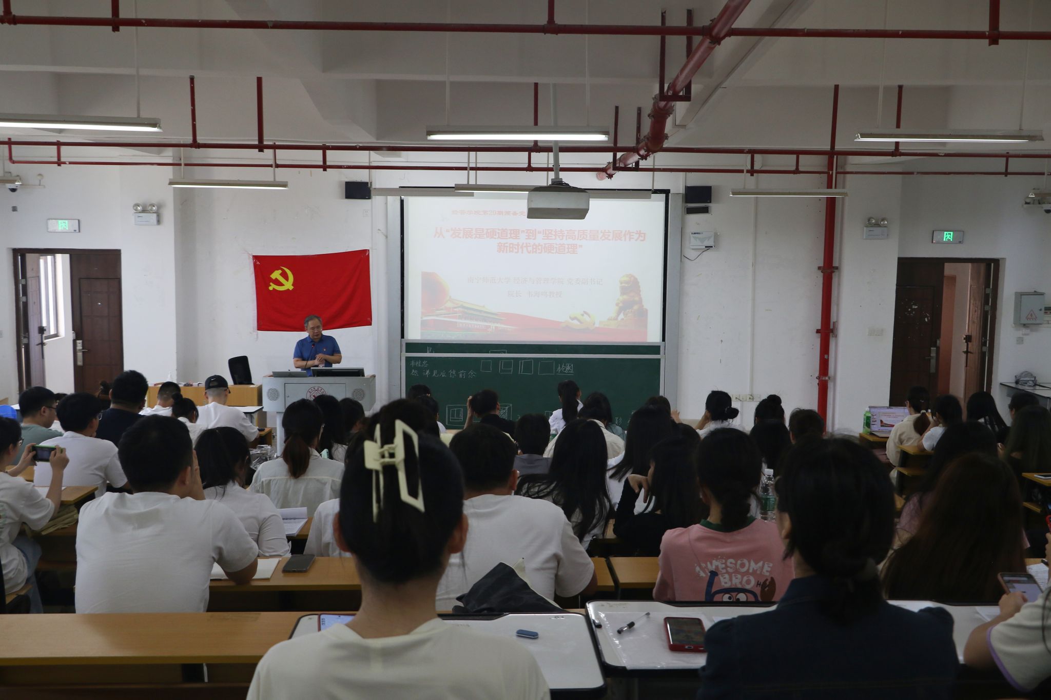 第二讲由韦海鸣院长紧密围绕“坚持高质量发展作为新时代的硬道理”的主题,重点从“发展是硬道理”的提出、高质量发展的提出、“新时代硬道理”的论断、区域的高质量发展、当代大学生的高质量发展五个方面进行深入讲解,使预备党员明白坚持发展是硬道理的战略思想不能动摇,紧跟新时代中国高质量发展的脚步,贯彻落实习近平总书记对广西“五个更大”重要的要求,把人生理想融入国家和民族的事业中,将个人奋斗融入新时代高发展格局。