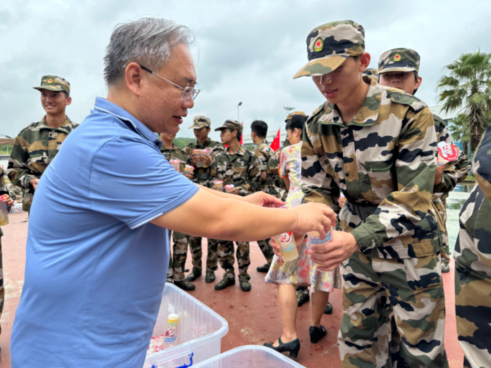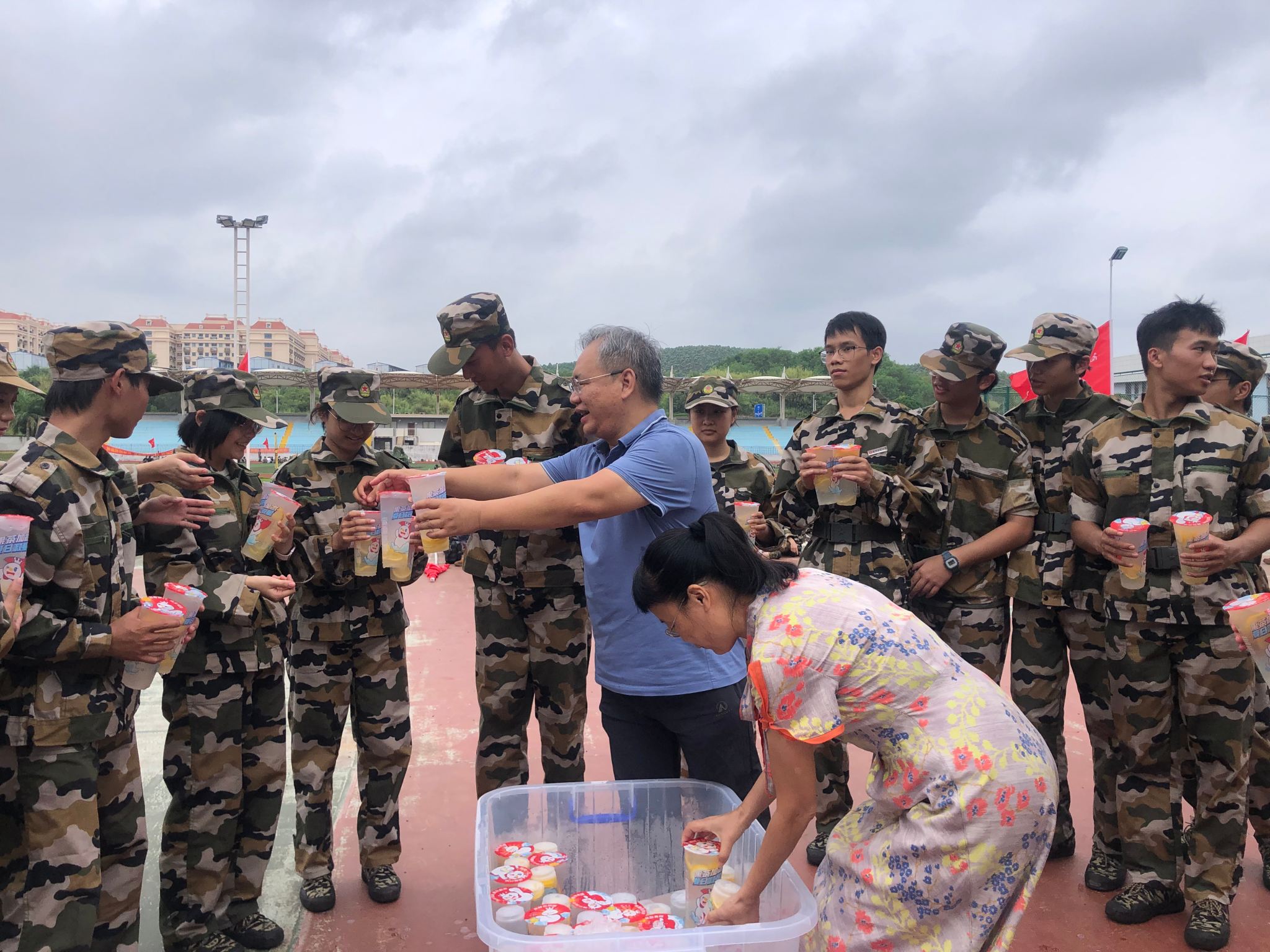 慰问活动中,韦海鸣书记发表了慰问讲话。韦书记对学生展现出的高昂训练热情表示赞赏,对学生们付出的努力和阶段性训练成果表示肯定。韦书记指出,希望学生在军训中要继续发扬不怕苦不怕累的精神,克服困难、努力训练、坚持到底。韦书记强调,军训是大学生锻炼意志,提升沟通能力,培养团队精神的良好契机,有助于大学生树立国防观念,增强爱国主义精神,提高大学生组织纪律性和自身身体素质。韦书记号召学生把握机会,以更加饱满的热情和更加坚定的信念持续投入到军训中去,展现经管学子不惧困难、百折不挠的精神风貌。随后,学院领导教师分发军训慰问品,学生们排队领取。