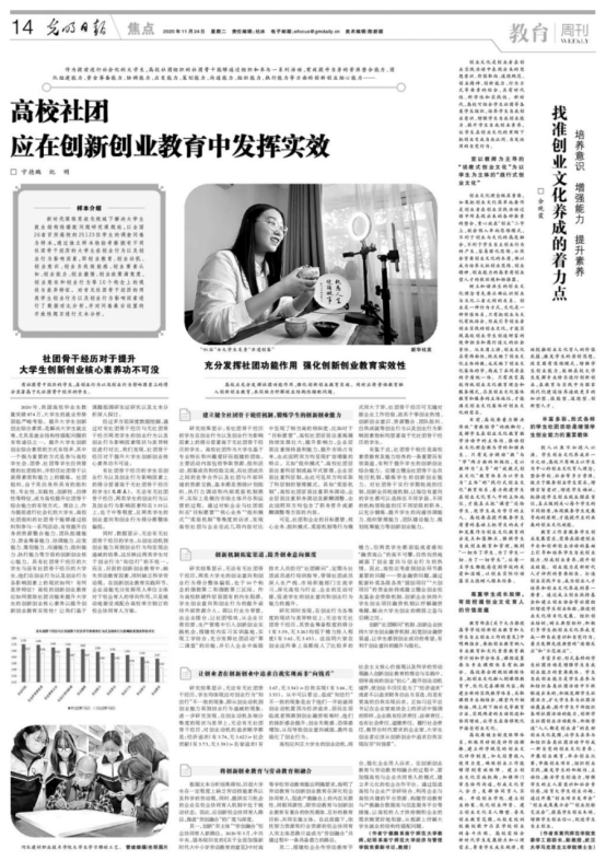 作为提前进行社会化的大学生,高校社团组织的社团骨干能够通过组织和参与一系列活动,有效提升自身综合的创新创业核心能力。BWIN必赢宁德鹏博士和党委副书记纪明教授(主持党委全面工作)结合学工管理及指导学生创新实践经验,凝练总结撰写了《高校社团应在创新创业教育中发挥实效》,并在《光明日报》11月24日14版发表。